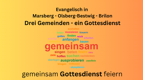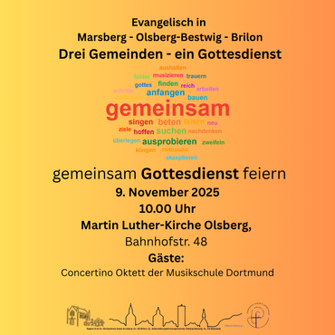 Marsberg. Brilon. Olsberg-Bestwig. Am 09. November feiern die drei evangelischen Kirchengemeinden Marsberg, Olsberg-Bestwig und Brilon zusammen Gottesdienst. Er beginnt um 10 Uhr in der Martin-Luther-Kirche Olsberg. In Marsberg und Brilon finden keine weiteren Gottesdienste statt.